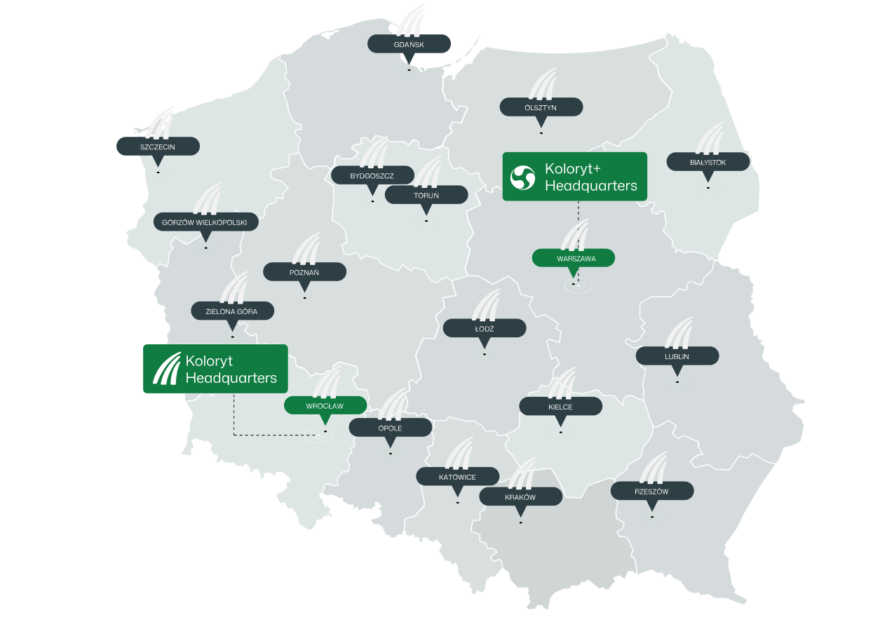 Koloryt Plus provides cleaning services in offices, manufacturing facilities, retail outlets, hospitals, warehouses, and other facilities. The company offers services nationwide. Thanks to its partnership with a partner company in Wrocław, it easily serves chain clients with facilities located in various locations.